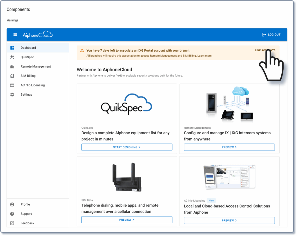 Have the designated branch administrator log into AiphoneCloud. There will be a prompt at the top of the page inviting you to link the IXG Portal account. Click Link Accounts.