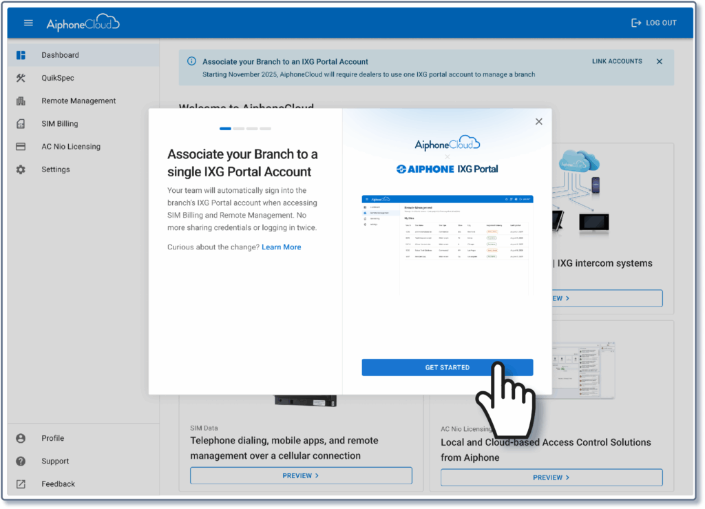 Dealer and Property Management branches in AiphoneCloud are required to link a primary IXG Portal account. This streamlines access for branch members when performing tasks in Remote Management and SIM Billing that require interaction with the IXG Portal. Linking an IXG Portal account is mandatory, and Remote Management and SIM Billing will not be accessible until this step is performed.