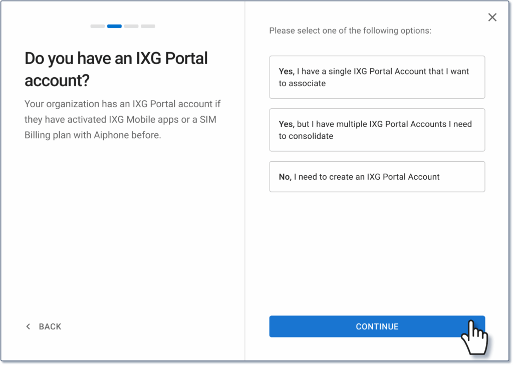 A message will appear asking if the is already an IXG Portal account in place, multiple IXG Portal accounts, or if an account needs to be created. Select the appropriate response, click Continue, then follow the prompts to log into the primary account or to create a new account.